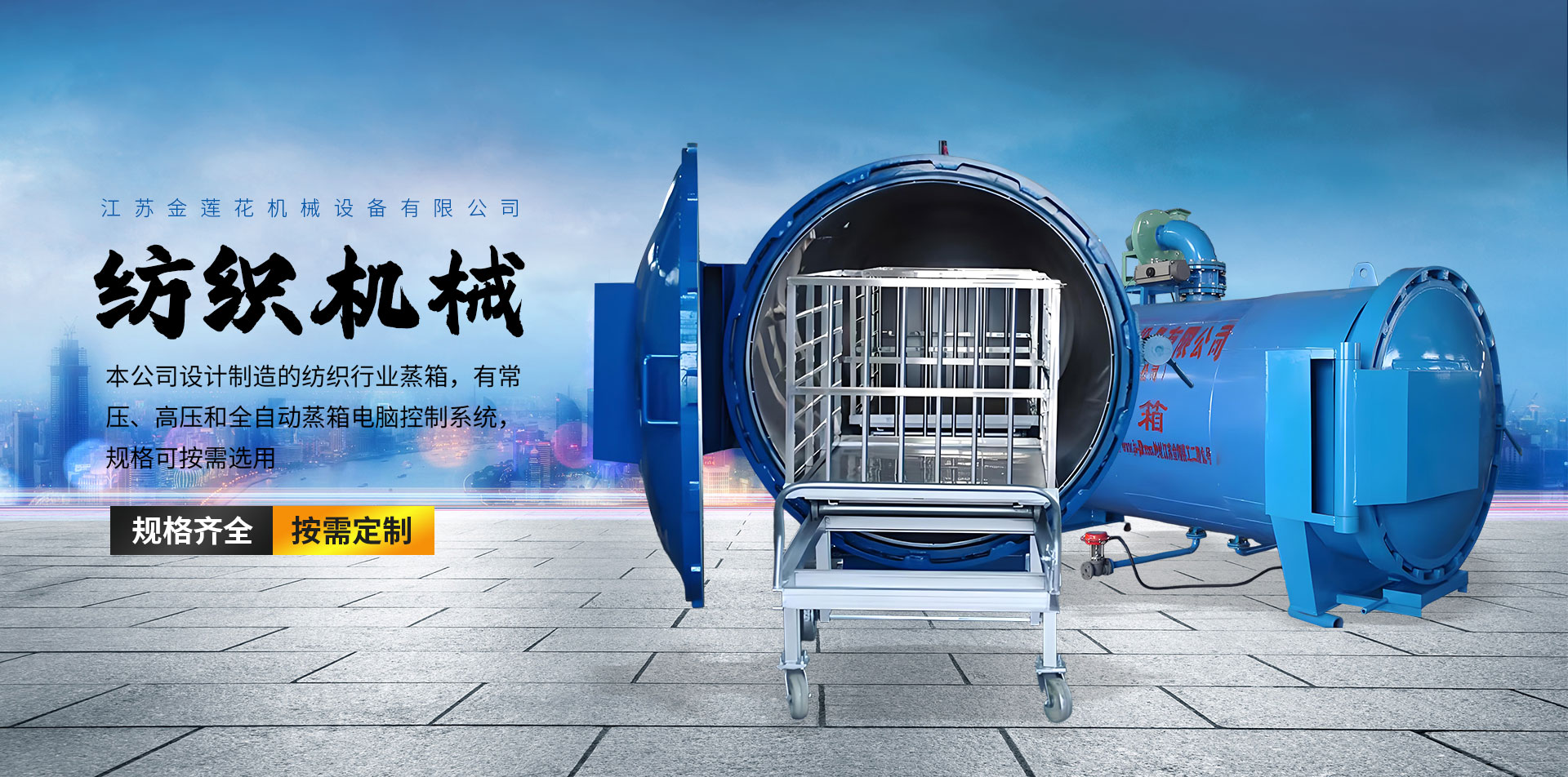 江蘇金蓮花機(jī)械設(shè)備有限公司位于魚(yú)米之鄉(xiāng)--金湖經(jīng)濟(jì)開(kāi)發(fā)區(qū)金蓮花路1號(hào),源于金湖縣輕工機(jī)械有限公司,至今已有三十多年企業(yè)文化。公司專(zhuān)業(yè)制造用于紡織行業(yè)的快速系列蒸箱(蒸紗鍋、真空定型蒸箱、蒸紗機(jī)、紗線(xiàn)真空定型機(jī)、全自動(dòng)紗線(xiàn)定型機(jī)、棉紗調(diào)濕定型機(jī)、氨綸紗加濕定型機(jī)、高溫高壓蒸紗鍋、低彈絲真空定型機(jī)、不銹鋼蒸箱、毛條熱定型機(jī)、窗簾定型機(jī)、電加熱蒸箱、羊絨線(xiàn)加濕定型機(jī)、熱定型機(jī)、全自動(dòng)襪子定型機(jī)、面料染色定型機(jī)、模板壓褶定型機(jī)、凹凸定型機(jī))和全自動(dòng)蒸箱電腦控制系統(tǒng);一、二類(lèi)壓力容器(泥漿分離器、換熱器、儲(chǔ)氣罐、蒸汽發(fā)生器、吸附塔、分氣缸、等等);各類(lèi)減速機(jī),真空泵;各類(lèi)閥。